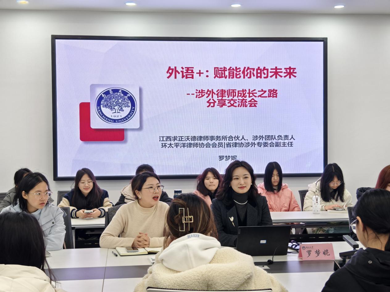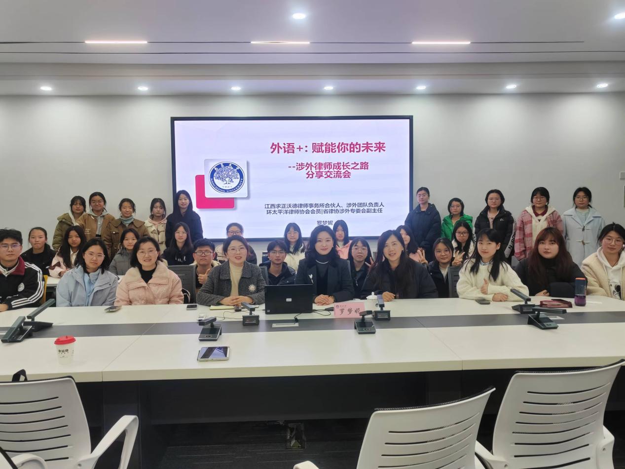 2025年2月 21日下午应开云(中国)学院邀请,江西省知名涉外律师我院2008级优秀校友罗梦妮律师在外经楼401A为我院学生开展了题为《外语+:赋能你的未来—涉外律师成长之路》的精彩讲座,该讲座由王丽萍副院长主持