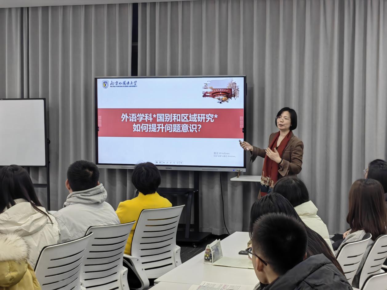 讲座伊始,吴江教授首先指出了外语初学者常面临的难题:语言水平远低于思维水平。她深入剖析了这一问题,并以此为契机,巧妙地引入了“国别和区域研究”与问题意识的相关探讨,为听众们打开了一个全新的研究视角。
