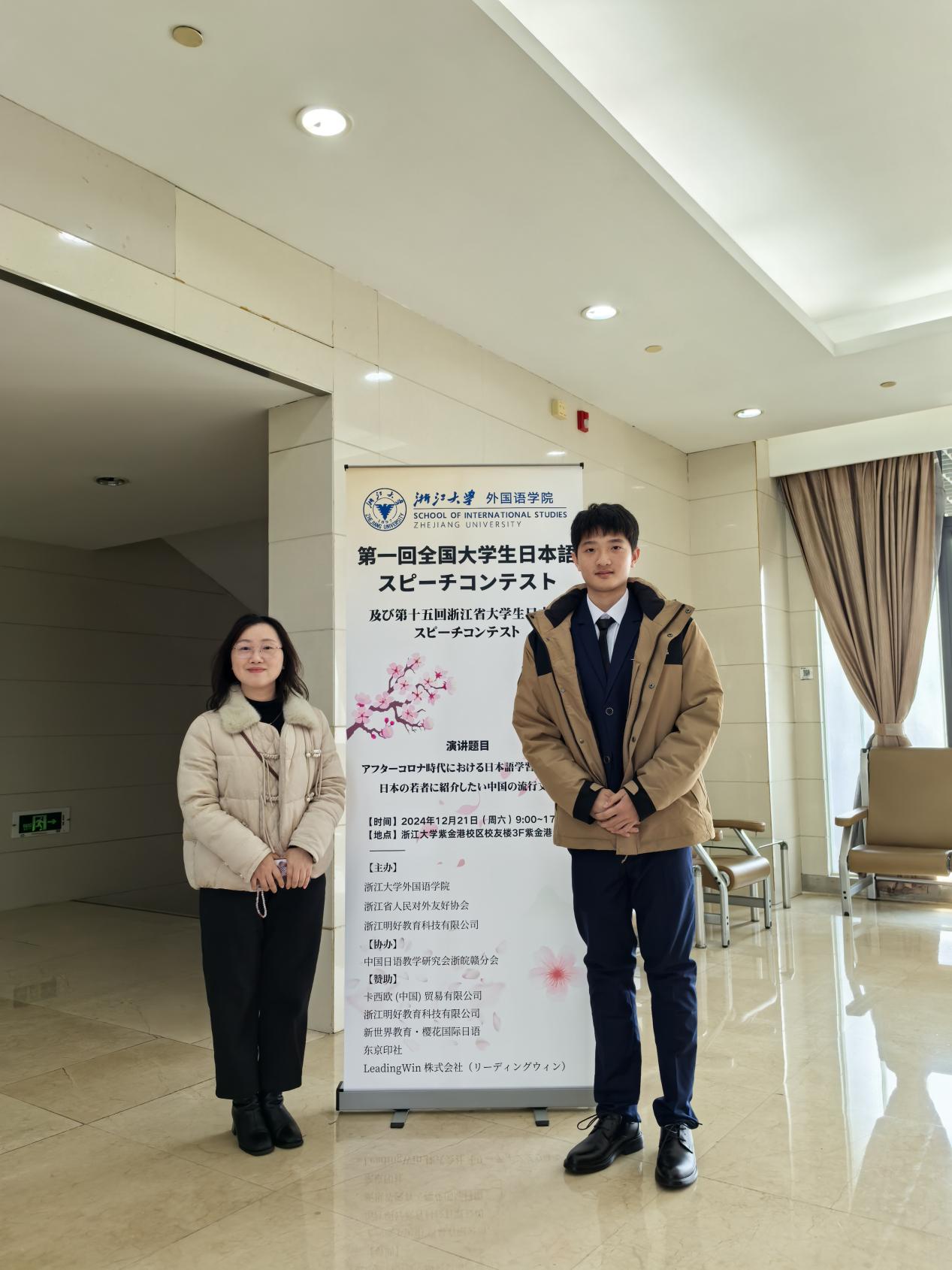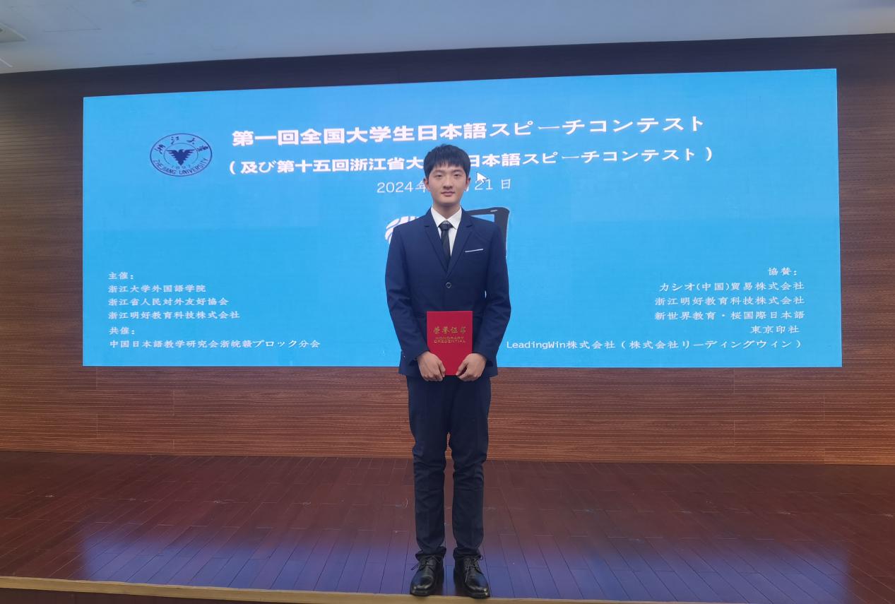 2024年12月21日,第一届全国大学生日语演讲比赛暨第十五届浙江省大学生日语演讲比赛决赛在浙江大学紫金校区顺利举行。我校徐佳俊同学凭借良好的表现获得国赛二等奖。