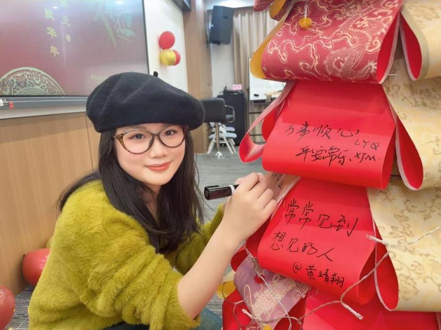 活动现场,同学们纷纷展示自己的手工作品——有五彩斑斓的手工灯、形态各异的锦鲤扭扭棒以及小巧精致的柿子灯,并在新年祈愿树上书写新年心愿,拍照留念,喜颜悦色。