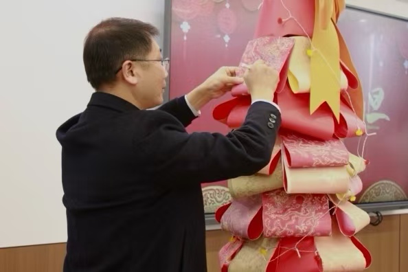 在接下里的“师生共筑新年树”环节中,陈夜雨院长代表学院题词赠言祝愿同学们学业有成、喜乐安康,不仅拉近了师生间的情感距离,同时也在场同学们感受到了新年的喜悦与温暖。