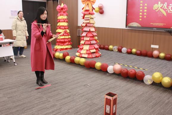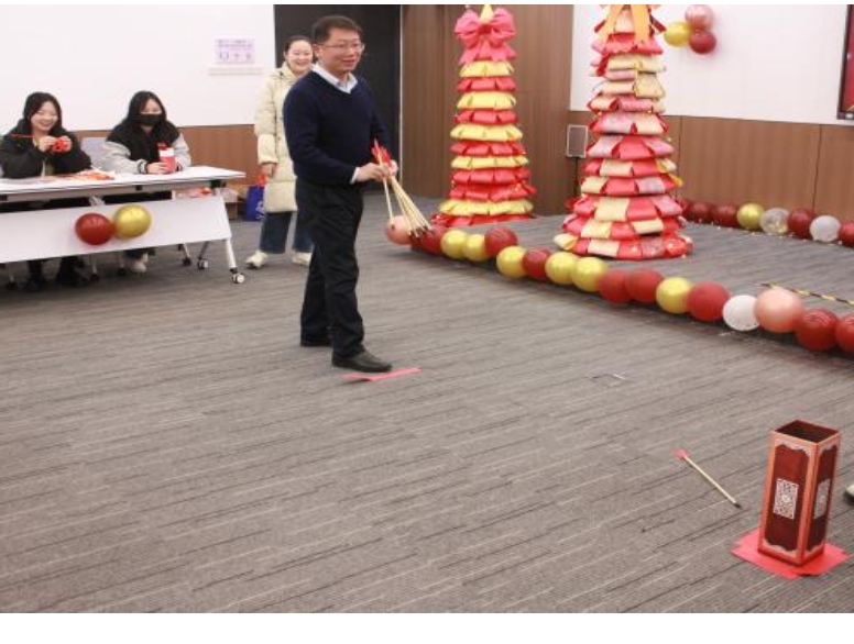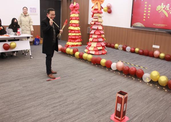 “非遗手工创意坊”与“趣味投壶”两大趣玩区相继展开。在创意坊中,大家以非遗手工灯、锦鲤扭扭棒等材料为媒介,挥洒创意与才华,制作出独具匠心的新年手工艺品。学院领导与同学们亲切互动,展示自己亲手制作的手工艺品,在镜头前合影留念。